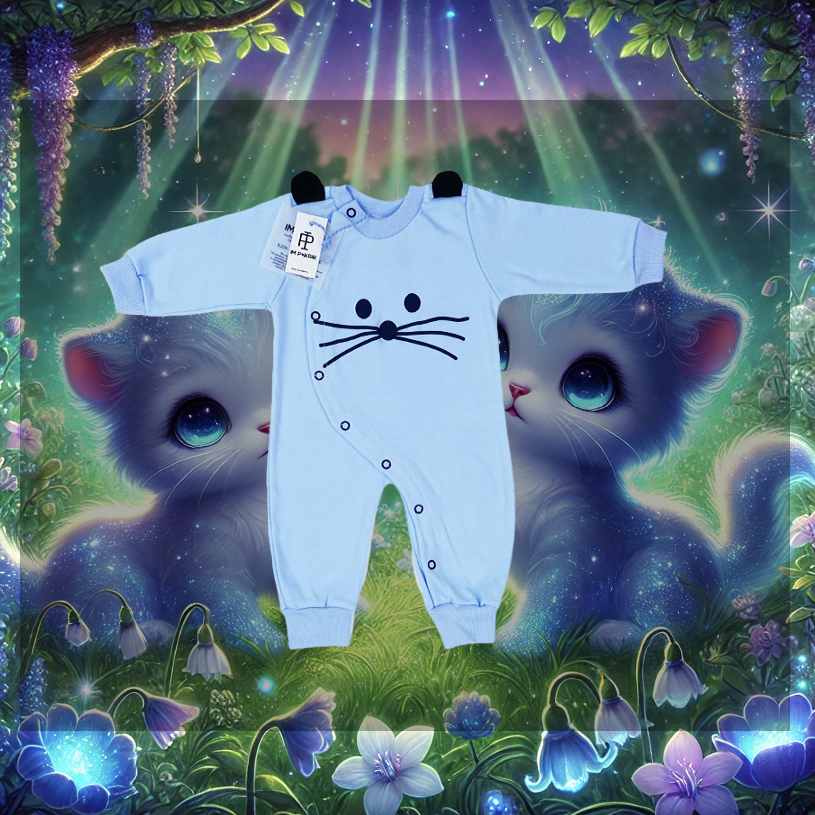 Der Babybody in Blau hat auf der Vorderseite ein entzückendes Design, das das Baby in eine niedliche Katze verwandelt.