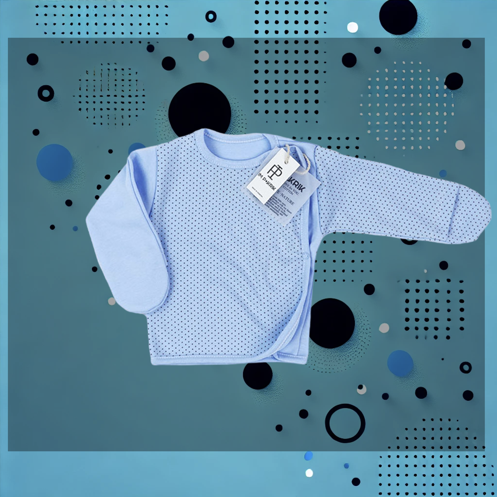 Die blaue Jacke für Babys ist ein entzückendes Kleidungsstück. Die Jacke ist mit fröhlichen Punkten verziert, die auf dem Stoff verteilt sind, was einen verspielten und lebendigen Eindruck vermittelt.