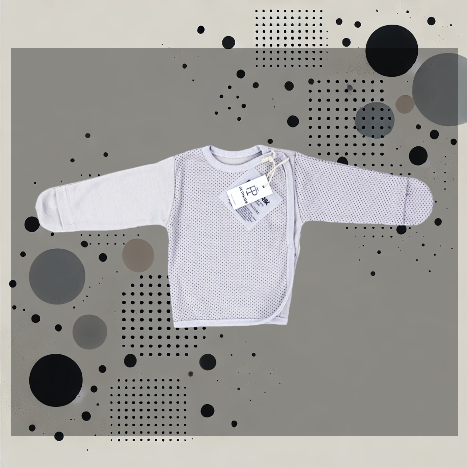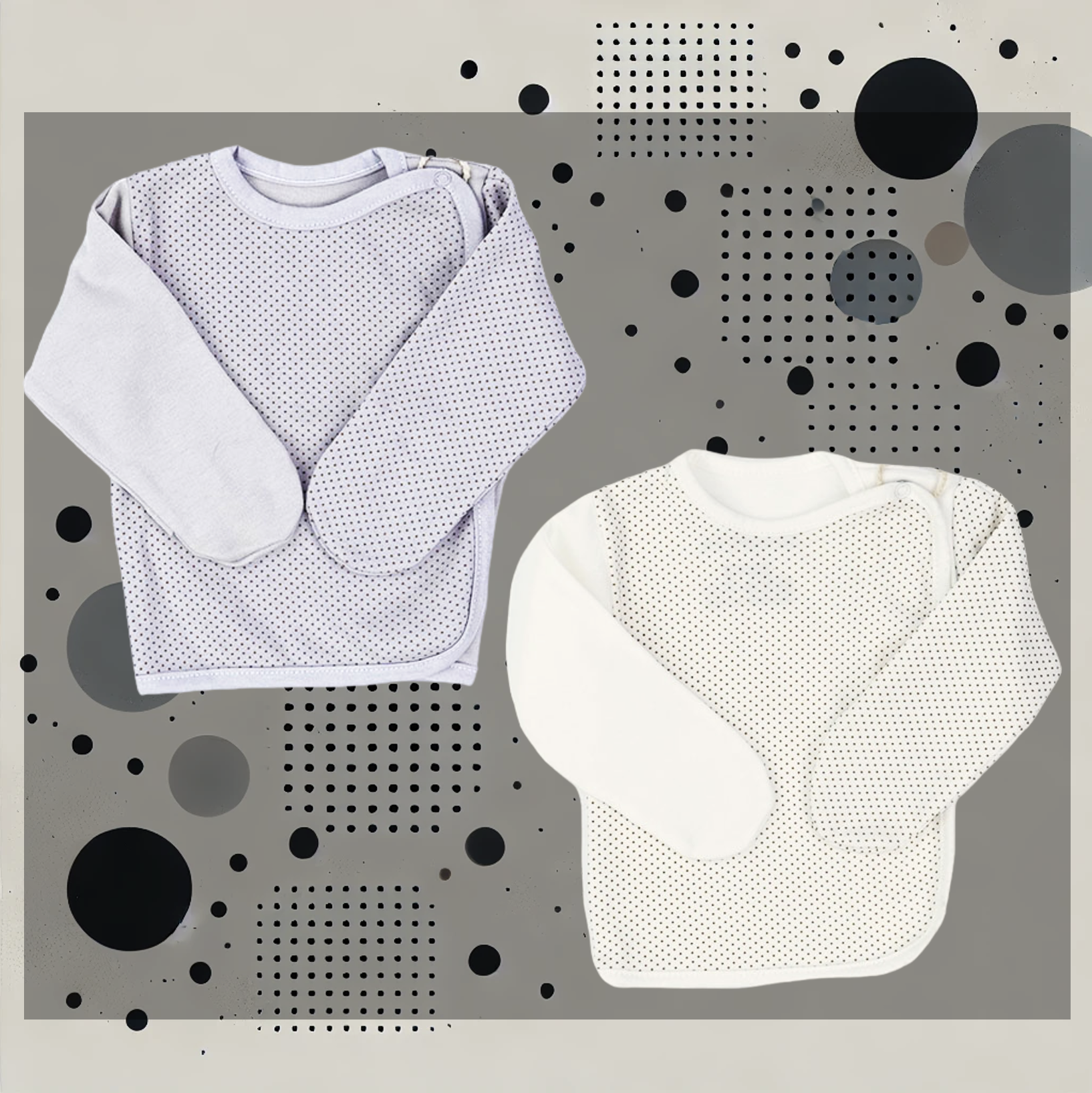 Die graue oder beige Jacke für Babys ist ein entzückendes Kleidungsstück. Die Jacke ist mit fröhlichen Punkten verziert, die auf dem Stoff verteilt sind, was einen verspielten und lebendigen Eindruck vermittelt.