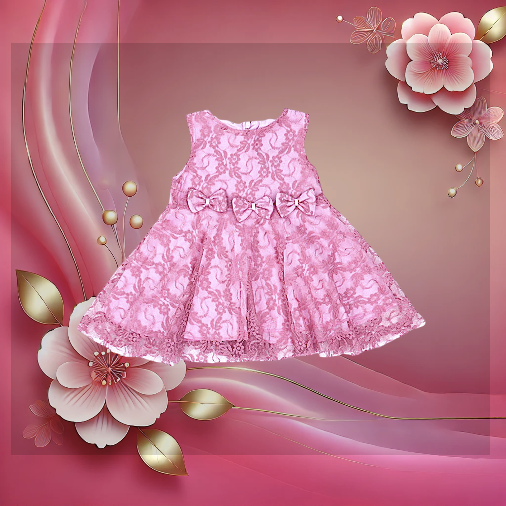 Das Kinderkleid besteht aus rosa Spitze und hat eine wunderschöne Ausstrahlung. Es ist perfekt für besondere Anlässe wie Taufe oder andere festliche Veranstaltungen.