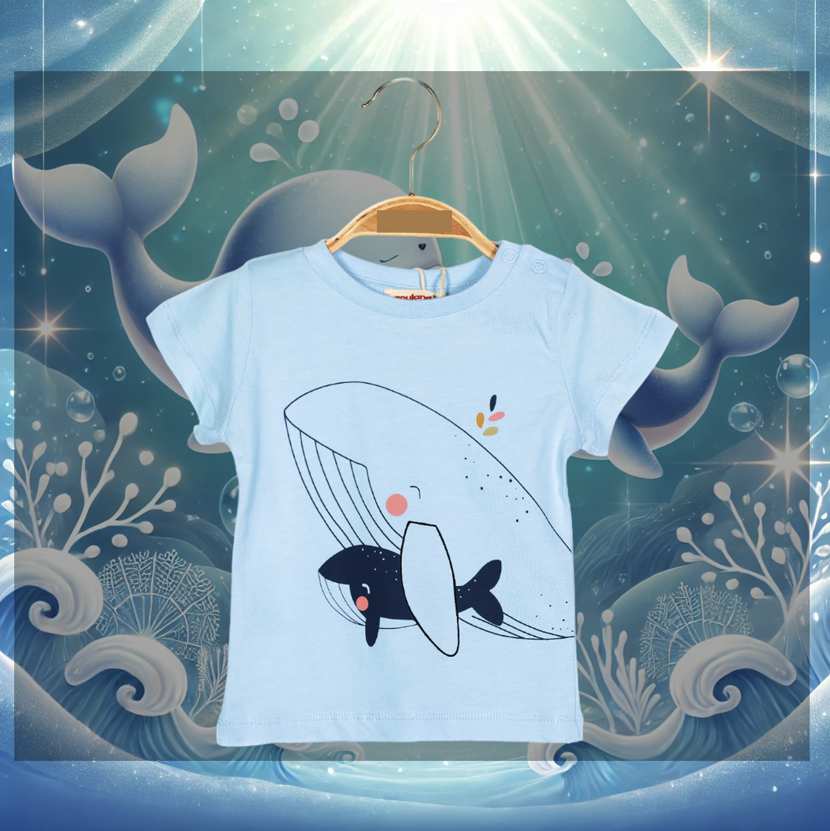 Das T-Shirt für Jungen mit dem Wal-Motiv besteht aus einem hellblauen Hemd auf dem zwei Wale abgebildet sind, die das Kind auf eine abenteuerliche Reise durch den Ozean mitnehmen. Der größere Wal umarmt den kleineren Wal liebevoll, während sie gemeinsam durch das tiefblaue Wasser schwimmen. Das Bild erzeugt eine Aura von Freiheit und Entdeckung, während das kräftige Blau des Hemdes eine tiefgründige Energie ausstrahlt, die das Baby dazu einlädt, sich auf eine Reise ins Unbekannte zu begeben.